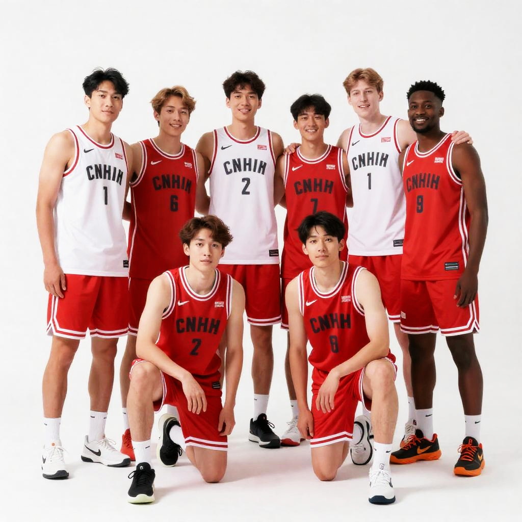 Photograph of a basketball team huddle. Six male players in red and white track suits stand around a coach in a gray suit, gesturing and speaking. One player in a white suit stands to the right. Indoor court background with bleachers. Players have short to medium-length hair. Coach points with his right hand, looking focused. Players have neutral to engaged expressions.