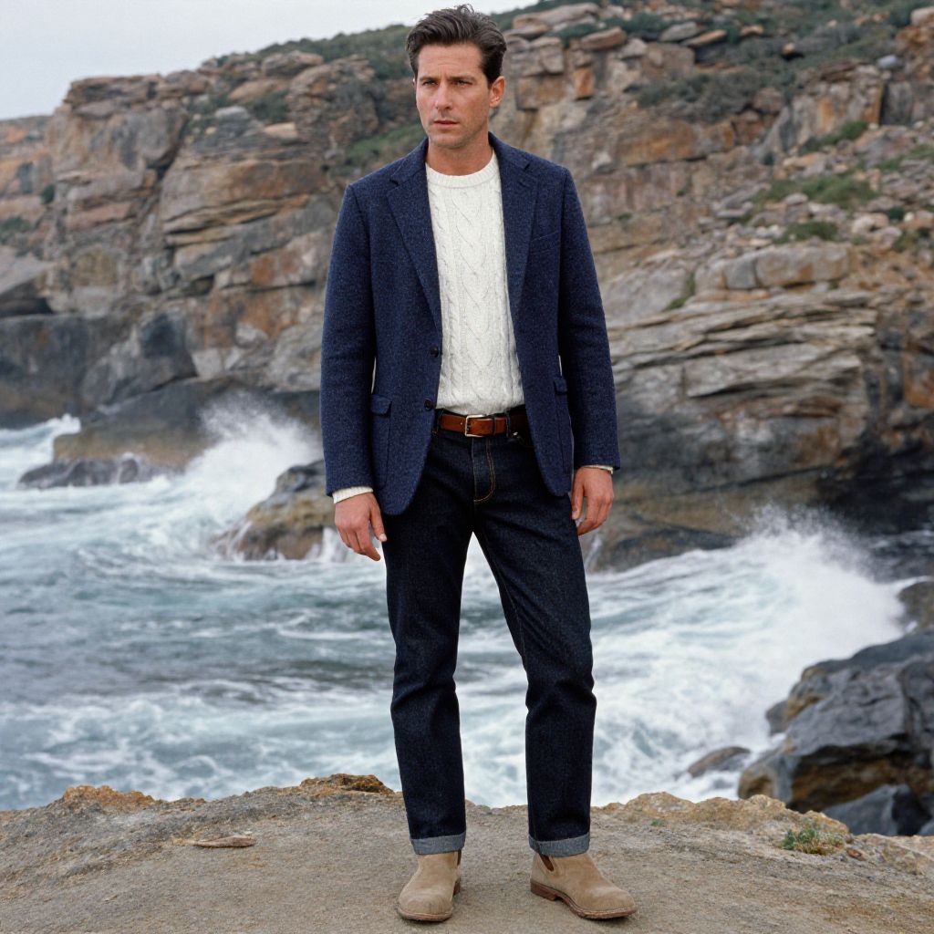 Photograph of a handsome, Caucasian man with short, dark brown hair standing on a rocky cliff by the ocean. He is wearing a dark blue, textured blazer over a white, textured knit shirt, dark blue jeans with a brown leather belt, and light brown, lace-up boots. His expression is serious and focused. The background features rugged, brown and gray rock formations with white-capped ocean waves crashing against them. The sky above is overcast, adding a moody atmosphere to the scene. The man is centered in the frame, with the ocean and rocks extending behind him.