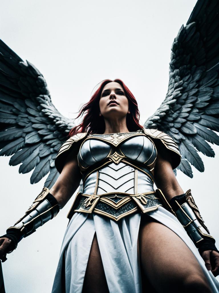 Woman in Warrior Angel Costume, cinematic realism, dramatic low-angle cosplay photo