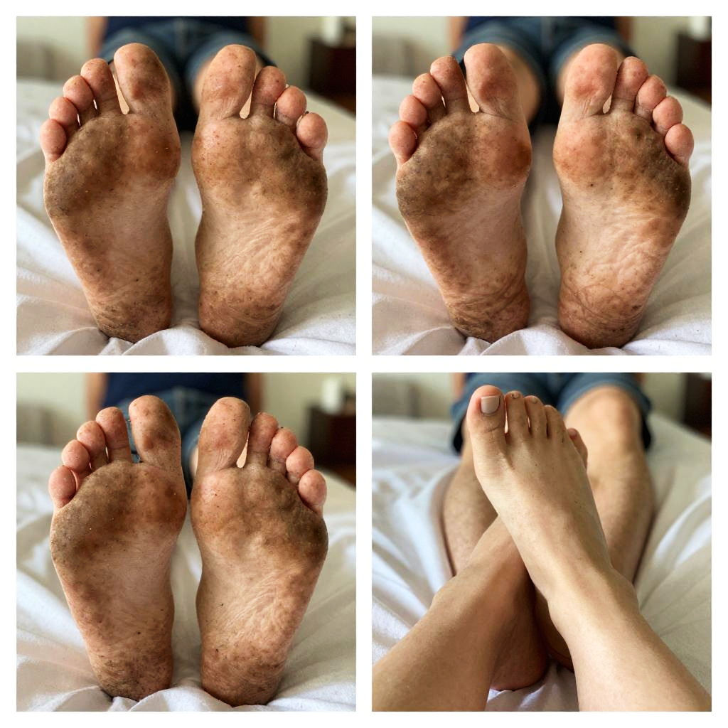 This collage of four photos shows close-ups of a person's dirty feet, with visible dirt and small stones on the soles. The feet are lying on a white, slightly rumpled bedspread. The top right photo shows the feet side by side, the top left has one foot slightly overlapping the other, the bottom left has one foot raised and resting on the other, and the bottom right shows both feet crossed. The background is softly lit, suggesting a bedroom setting.