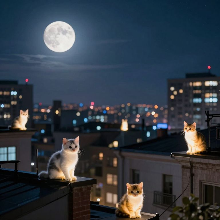 A nocturnal cityscape bathed in moonlight, where luminous kittens perch serenely atop every rooftop, defying gravity and reality in a magical urban tableau.