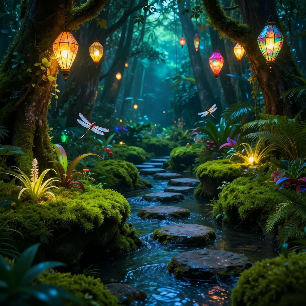 Enchanting forest scene: glowing lanterns, colorful fairy lights, lush moss-covered path, blue-tinted stream, vibrant dragonflies, and
