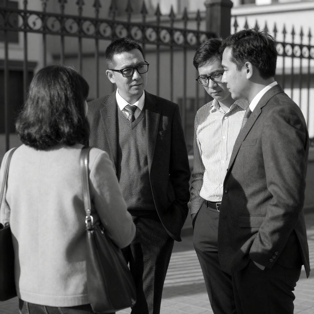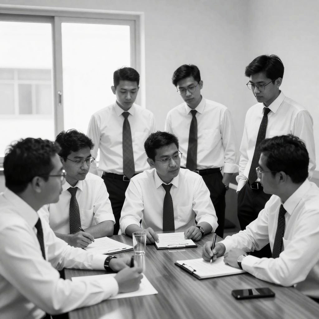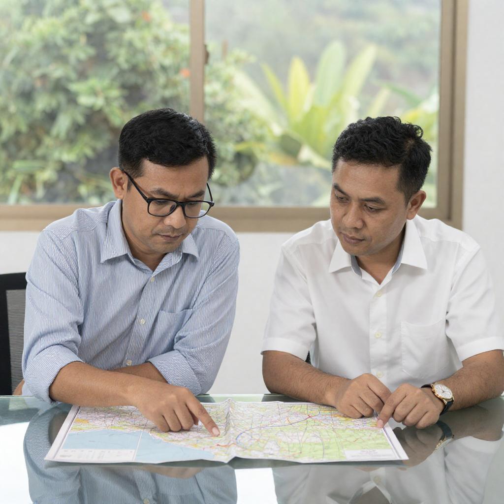 Two men in a room, sitting at a glass table. The man on the left, wearing glasses and a blue striped shirt, points at a map. The man on the right, in a white shirt, looks at the map. Both have focused expressions. Background includes large windows with greenery outside.