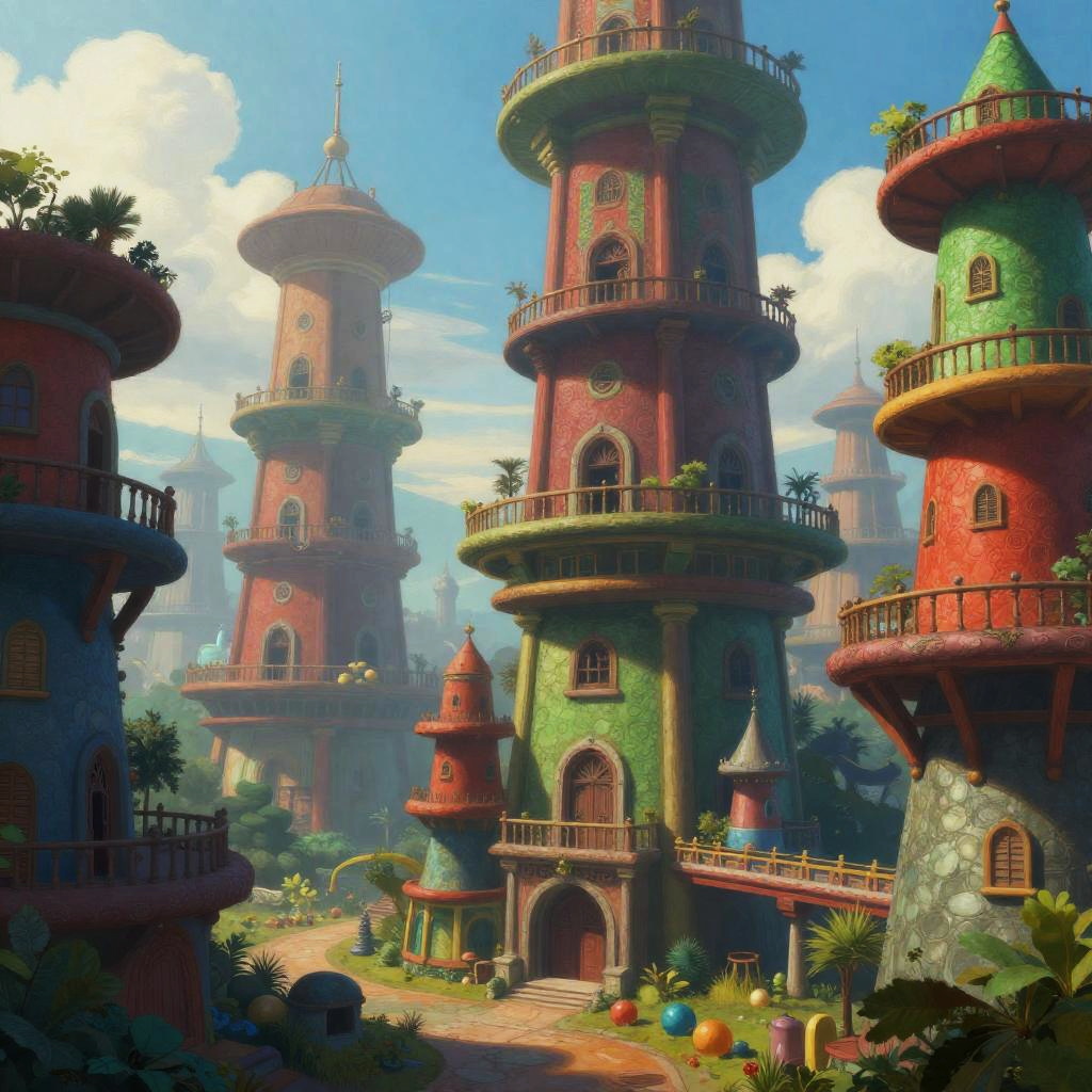 A surreal fantasy cityscape with towering, interconnected buildings stacked in a complex architectural style, vibrant and saturated colors including red, green, blue, with a painterly, detailed, and colorful look, the scene has a whimsical and imaginative atmosphere with bright light and soft clouds in the background