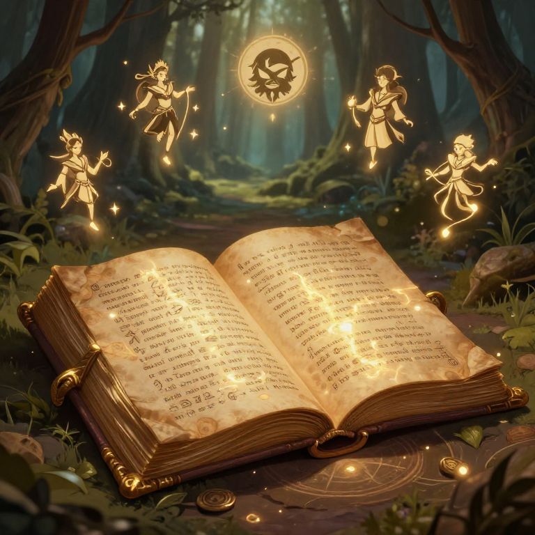 A digital fantasy artwork depicts an enchanted forest at night with a glowing, ancient, open book at the center, its pages radiating golden light. Surrounding the book are four ethereal, golden fairy-like creatures, each floating and casting sparkles. Above the book, a glowing, circular emblem with a mystical symbol hovers. The forest background is lush with tall trees, dense foliage, and a path leading deeper into the woods. The book's text is illuminated, with intricate, magical symbols and script. The scene exudes a mystical, magical aura, blending elements of fantasy and enchantment.