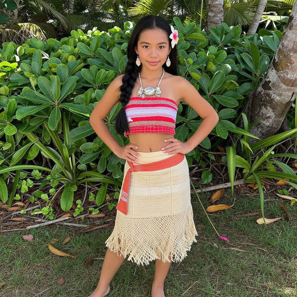 Photograph of an Asian girl with long black hair, adorned with a red and white flower, standing outdoors. She wears a red and white striped tube top and a cream-colored, woven hibiscus skirt with a red sash. She has large, white, dangling earrings and a white necklace. Her hands rest on her hips, and she smiles slightly. The background features lush green foliage, including large leaves and a palm tree trunk, with grass and a few scattered leaves on the ground. The image is brightly lit and vividly colored.