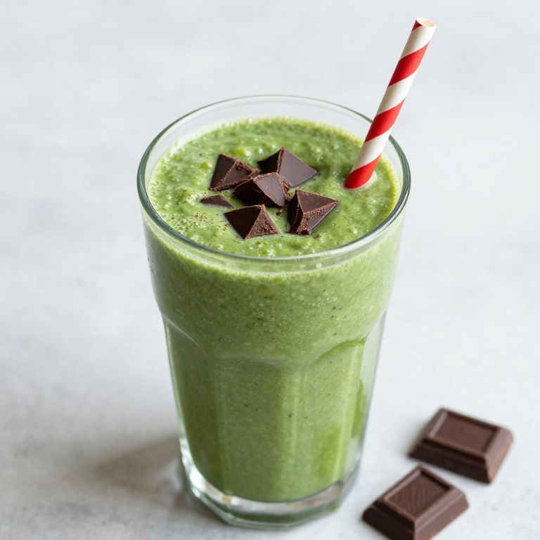 Vibrant green smoothie topped with dark chocolate chunks and served in a glass with a red-and-white striped straw, ready for a refreshing vegan treat. #vegan #healthy #giveaway