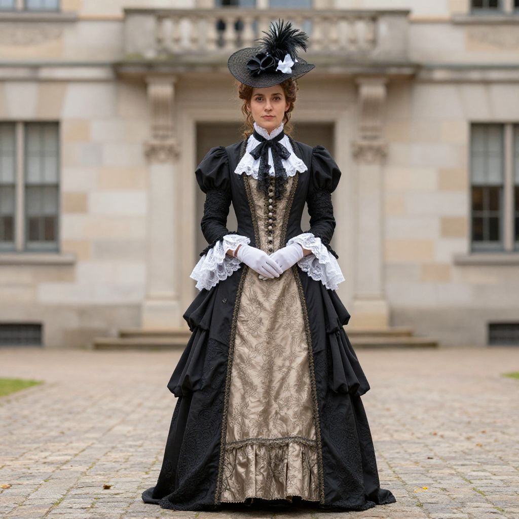 Photograph of a young woman standing in front of an elegant, stone building with large windows. She wears a Victorian-style black dress with intricate gold embroidery, puffed sleeves, and white lace trim at the cuffs and collar. Her black hat is adorned with a large black feather. She has fair skin, brown hair styled up, and wears white gloves. The cobblestone path beneath her contrasts with the stone building's beige and gray tones. The image has a slightly vintage, over-saturated color style, emphasizing the historical costume. The background is slightly blurred, focusing attention on her detailed attire.