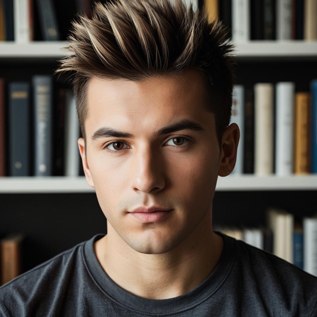Ured faux hawk hairstyle, photorealistic, portrait, young man, brown hair, spiked hairstyle, short sides, clean-shaven, brown eyes, neutral expression, wearing dark grey t-shirt, soft lighting, indoor background, blurred shelves with books in background, realistic ures, subtle shadows, casual style, upper body shot, front view, medium close-up, realistic skin tones, modern look
