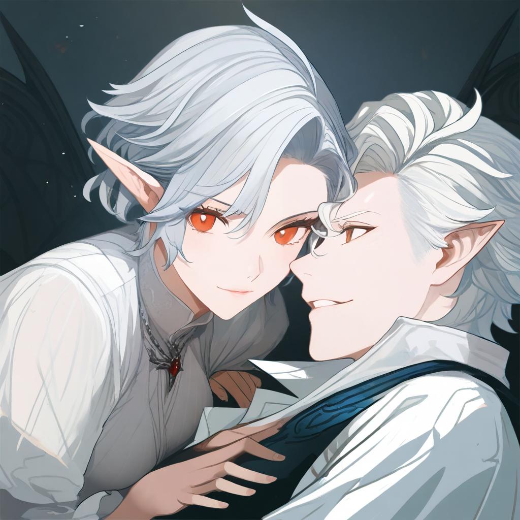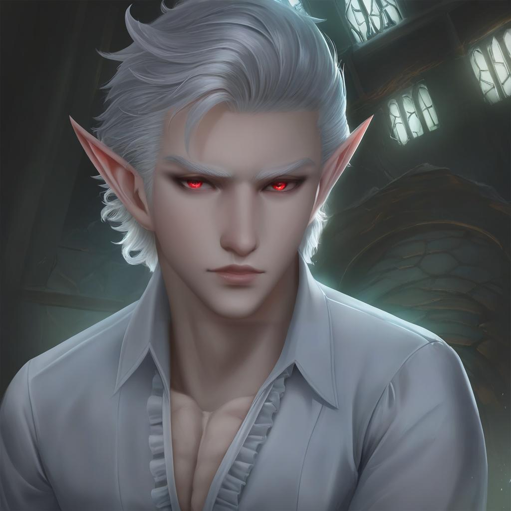 Astarion, baldur's gate, 1boy, red eyes, short hair, white hair, grey hair, white shirt, vampire, elf, by artist curss, leet