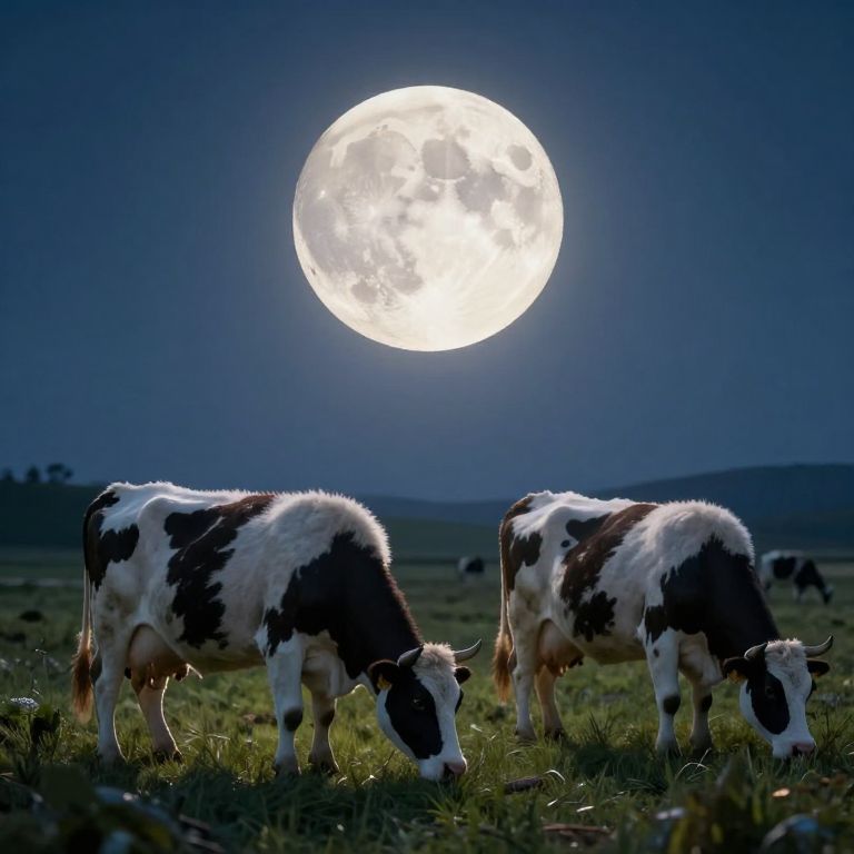 Photograph of two black-and-white Holstein cows grazing in a grassy field at night under a bright, full moon. The moon dominates the dark blue sky, casting a bright glow on the cows. The cows are positioned in the foreground, with one on the left and one on the right, both with their heads down, eating grass. The field extends into the background, where more cows are faintly visible. The texture of the cows' fur and the grass is detailed, contrasting with the smooth, glowing moon. The overall scene is serene and picturesque, highlighting the natural beauty of the nighttime landscape.