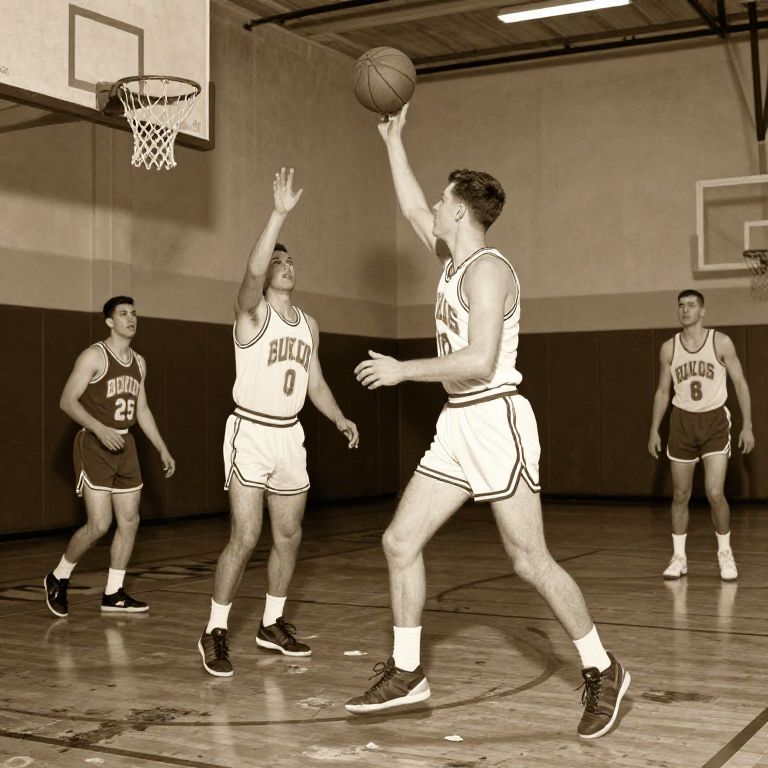 Basketball wallpapers depicting a vintage basketball scene from the 1950s, sepia-toned gymnasium, players wearing retro uniforms, action shot with classic wooden basketball and worn-out court, evoking nostalgia and passion for the sport.