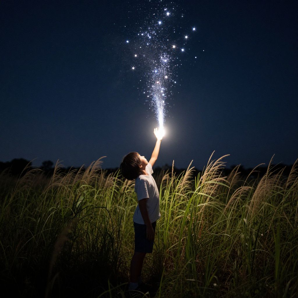 A child stands in a field of tall grass, reaching toward the heavens as a radiant stream of starlight erupts from their outstretched hand, illuminating the night sky with a celestial cascade of light and wonder.