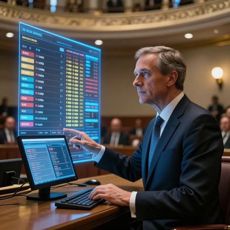 A visionary politician in a modern legislative chamber, using an AI system to project real-time voting trends and public sentiment, soft blue and gold lighting, immersive digital interface, realistic skin texture, high-resolution, sci-fi realism.