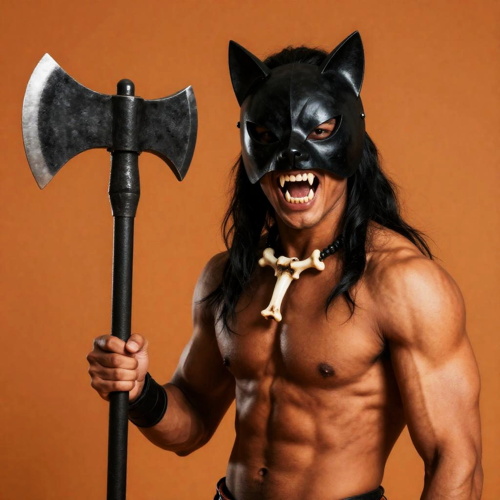 Muscular Man in Black Cat Mask Holding Double-Headed Axe
