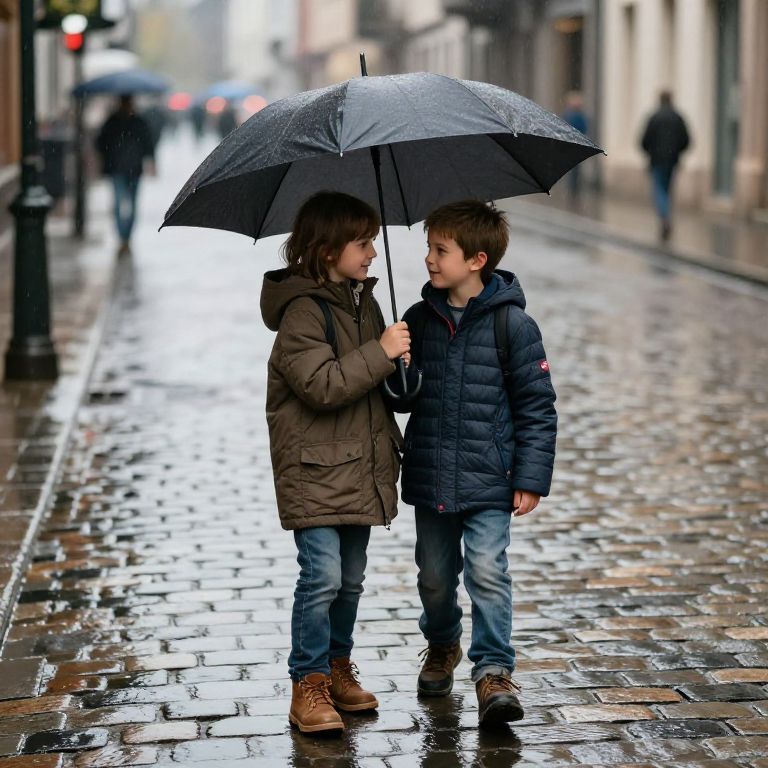 Brotherly support during a rainy day, two siblings sharing an umbrella on a cobblestone street, reflections on wet pavement, muted palette with splashes of color, gentle smiles and caring gestures, photorealistic style, intimate urban moment