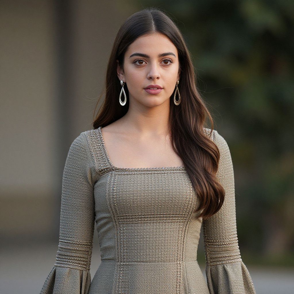 "isabela madrigal costume, 1girl, solo, dress, realistic, jewelry, earrings, long hair, brown hair, long sleeves, looking at viewer, sleeves past wrists, brown eyes, standing Realistic photo of casual sexy person with pretty face"