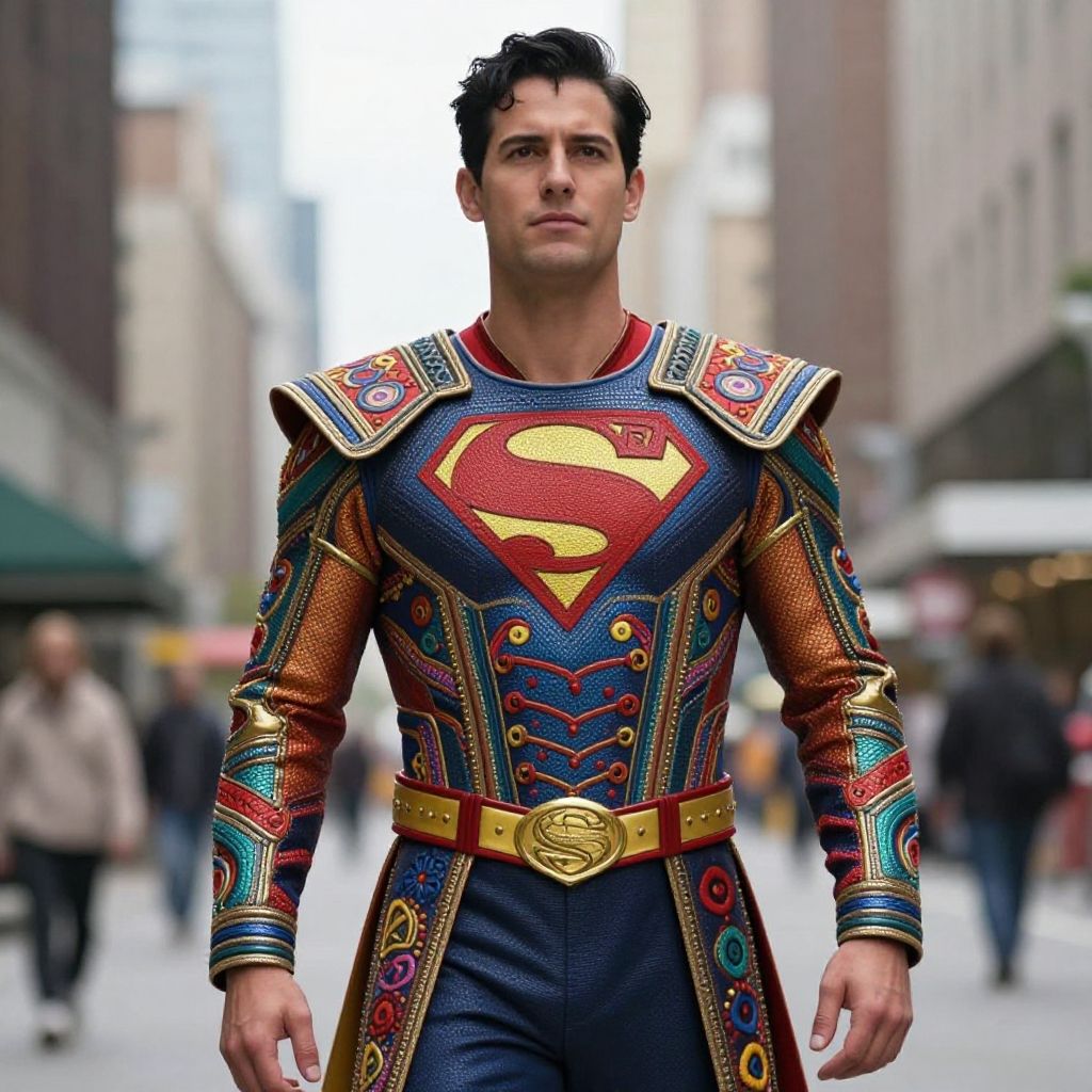 Photorealistic digital image of a muscular man in a vibrant, detailed Superman costume with colorful patterns, standing confidently in a blurred urban street.
