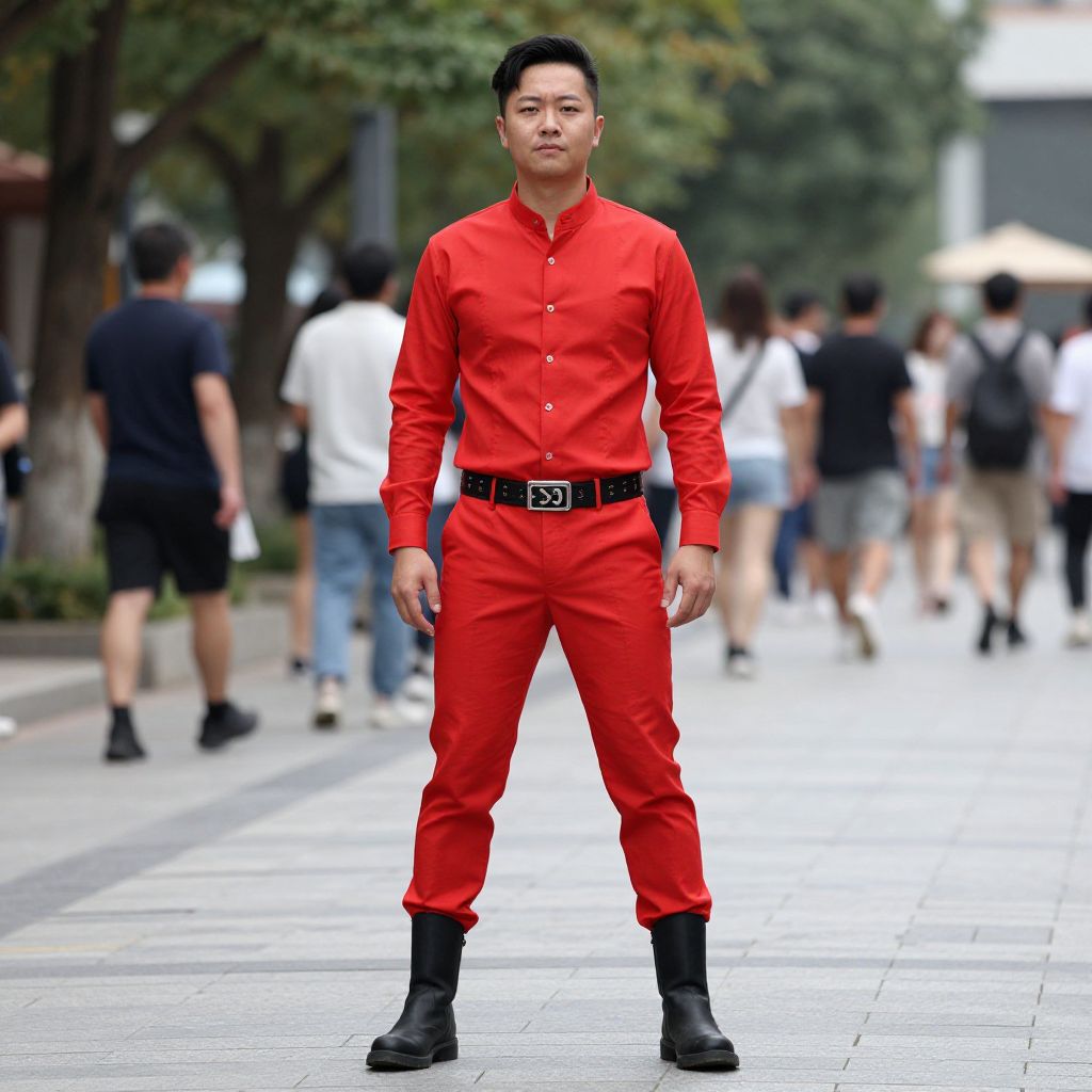 Photograph of an East Asian man in a bright red button-up shirt, pants, and black belt with boots, standing confidently on a city sidewalk with