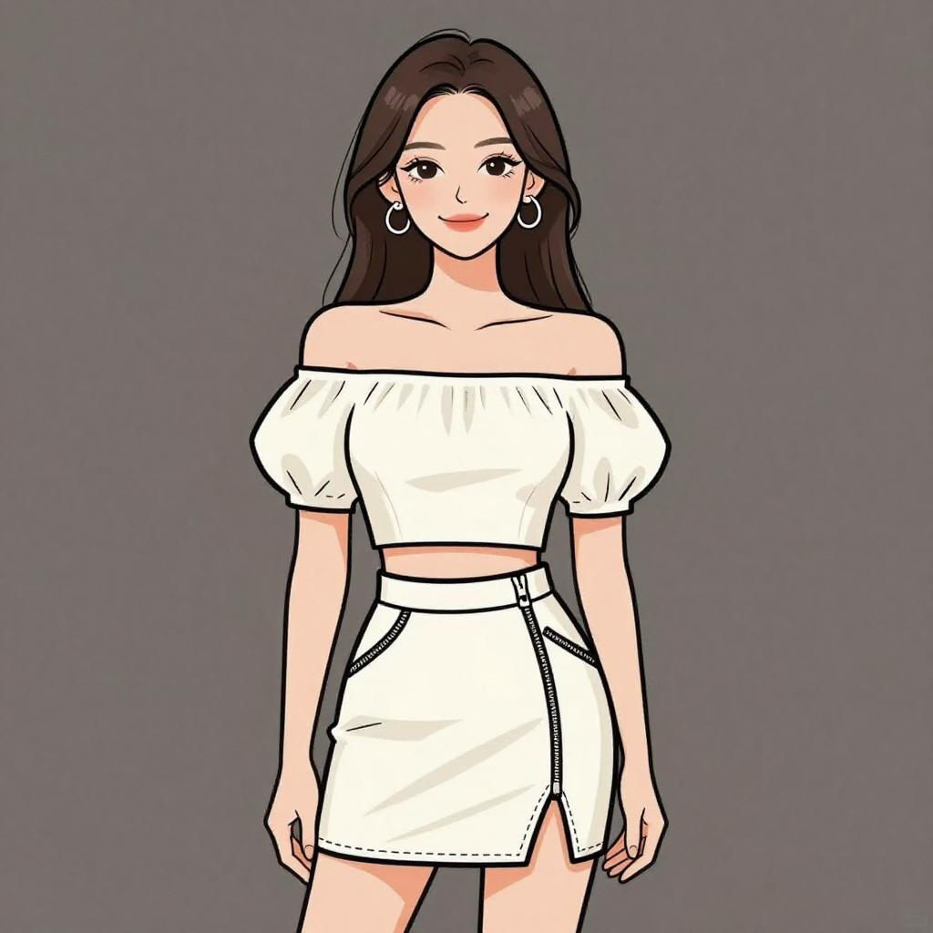 Woman with pretty face and pretty hair. smiling Woman, casual chic, off-the-shoulder white crop top, short puff sleeves, high-waisted white mini skirt, black piping and geometric embroidery, exposed zipper detail. --sref 1467