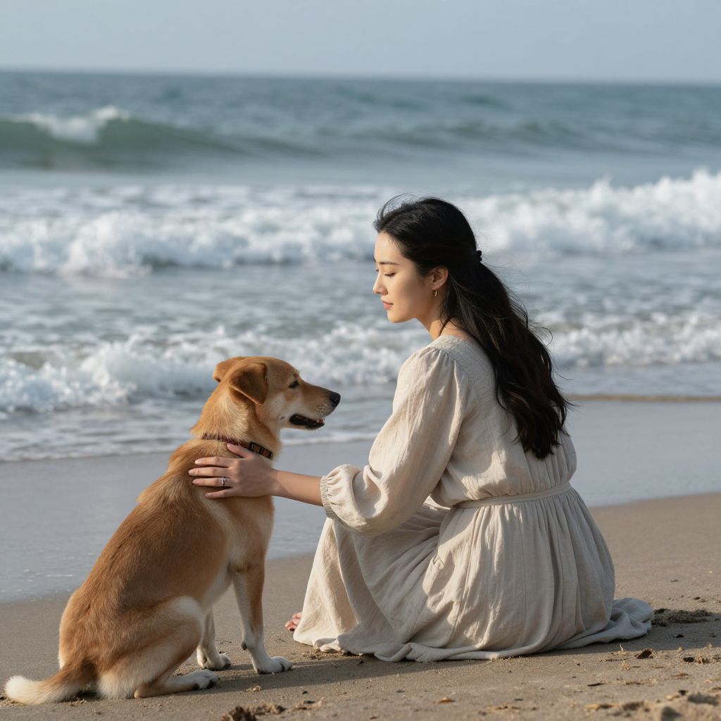 Serenity whispers through the gentle waves as a woman in timeless grace sits by the shore, her hand resting on a loyal companion, embodying the quiet harmony of connection and the enduring embrace of nature.