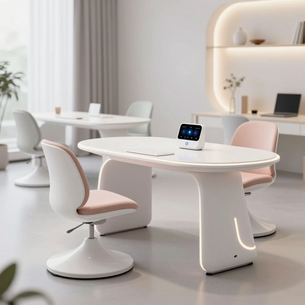 AI furniture collection showcasing smart chairs and tables with adaptive ergonomics, built-in sensors and voice-controlled mechanisms, sleek white and pastel tones, futuristic home office environment, soft glowing LEDs highlighting contours