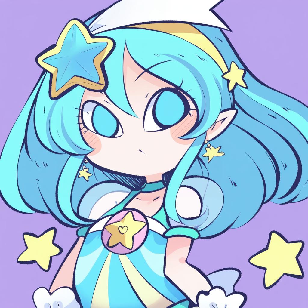Cure milky, precure, 1girl, pointy ears, aqua eyes, blue eyes, hair between eyes, star-shaped pupils, star in eye, aqua hair, long hair, blue hair, medium hair, short hair, star hair ornament, yellow hairband, collarbone, see-through sleeves, choker, aqua choker, puffy short sleeves, star earrings, magical girl, magical girl, wrist cuffs, by artist chahan (fried rice0614), leet