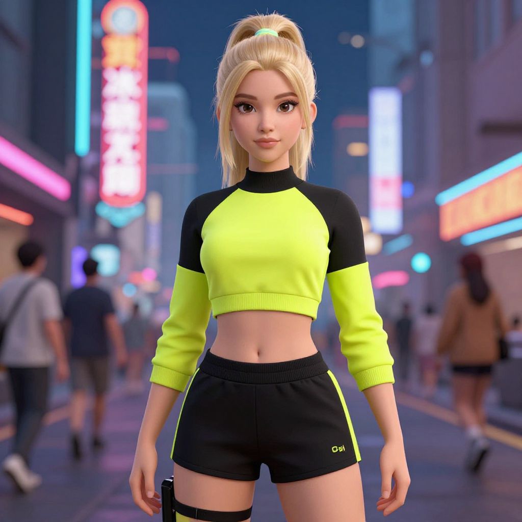 A digitally rendered fit woman with long blonde hair is shown wearing a blue athletic crop top and orange leggings against a soft gradient background. The image features a highly detailed and stylized digital art style emphasizing muscle tone and smooth skin textures.