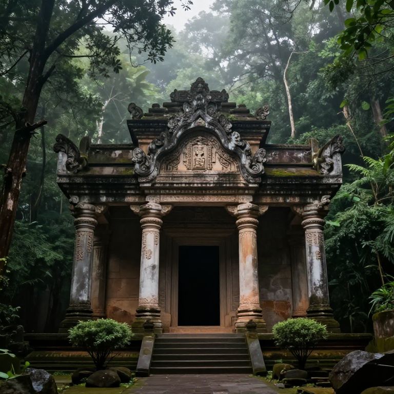 The image depicts an ancient temple nestled in a dense, misty forest. The temple, constructed from weathered stone, features a grand entrance flanked by six tall, intricately carved columns. The pediment above the entrance is adorned with ornate carvings, and the roofline is embellished with decorative elements. Steps lead up to the entrance, flanked by small shrubs and rocks. The surrounding forest is lush and dark, with tall trees and underbrush creating a sense of mystery and age. The overall composition is balanced, with the temple centrally positioned and the forest elements framing it, creating a harmonious and serene scene.