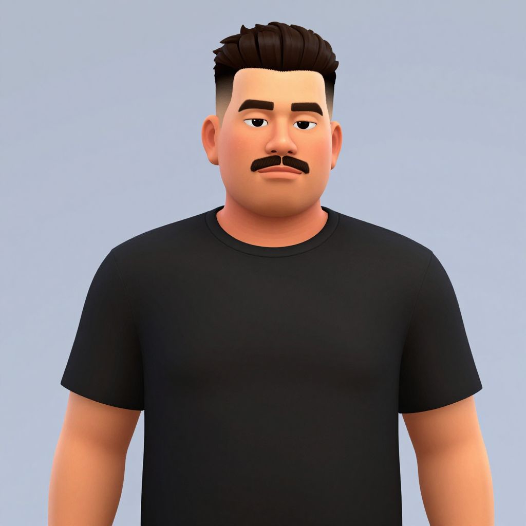 3D cartoon of a chubby man with dark brown hair, thick black mustache, and black shirt, looking to the side.