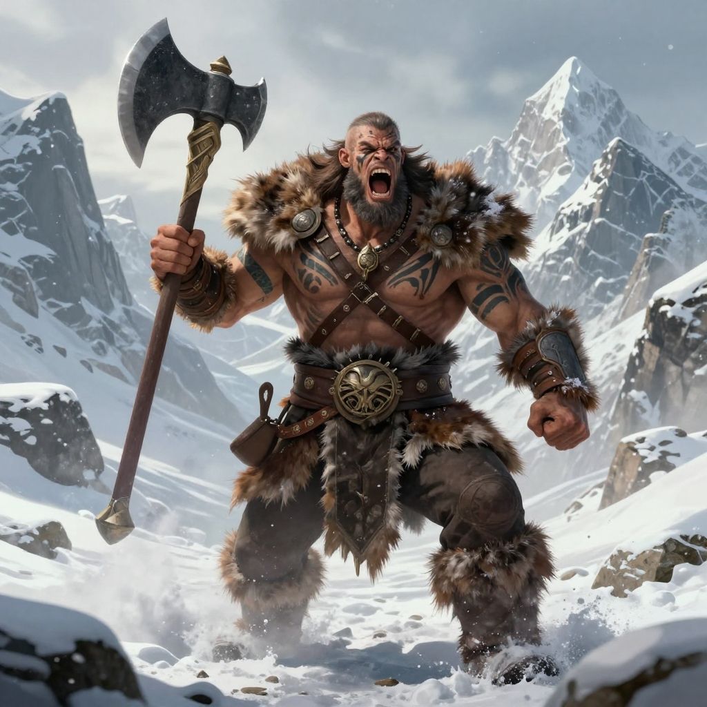 CGI illustration of a muscular, bearded Viking warrior shouting in rage, holding a large, double-edged axe in his right hand. He is dressed in a fur-lined loincloth, fur arm bands, and a leather belt with a large, ornate metal buckle. His chest and arms are adorned with tribal tattoos. The background features a snowy, mountainous landscape with jagged peaks and a cloudy sky. The warrior's fur clothing is dark brown, contrasting with the bright white snow. His expression is fierce, with bared teeth and intense eyes. The image has a dynamic and action-packed feel.