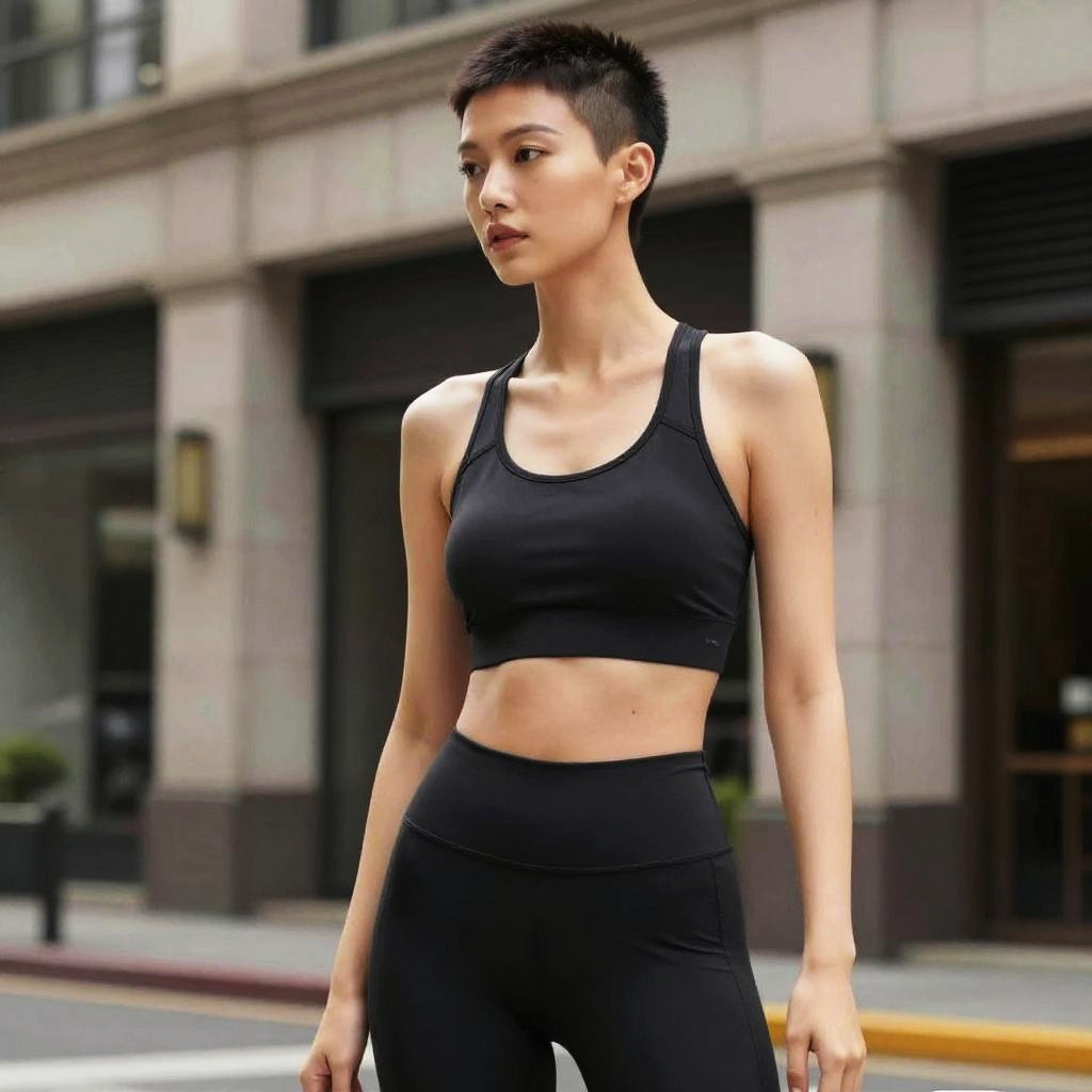 Short Hair Undercut hairstyle on fashion model, wearing sport bra and compression leggings, in city scene, captured in fashion editorial style with glossy lighting.