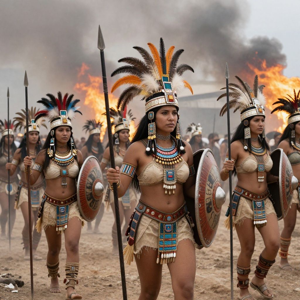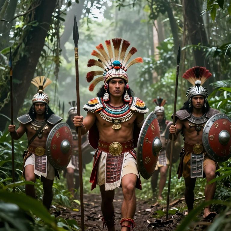 Tzilacatzin leading Aztec warriors through a dense, mist-covered jungle, light filtering through tall trees, warriors in traditional battle gear with shields and spears, heroic and epic atmosphere, bright color palette with detailed textures and realistic lighting