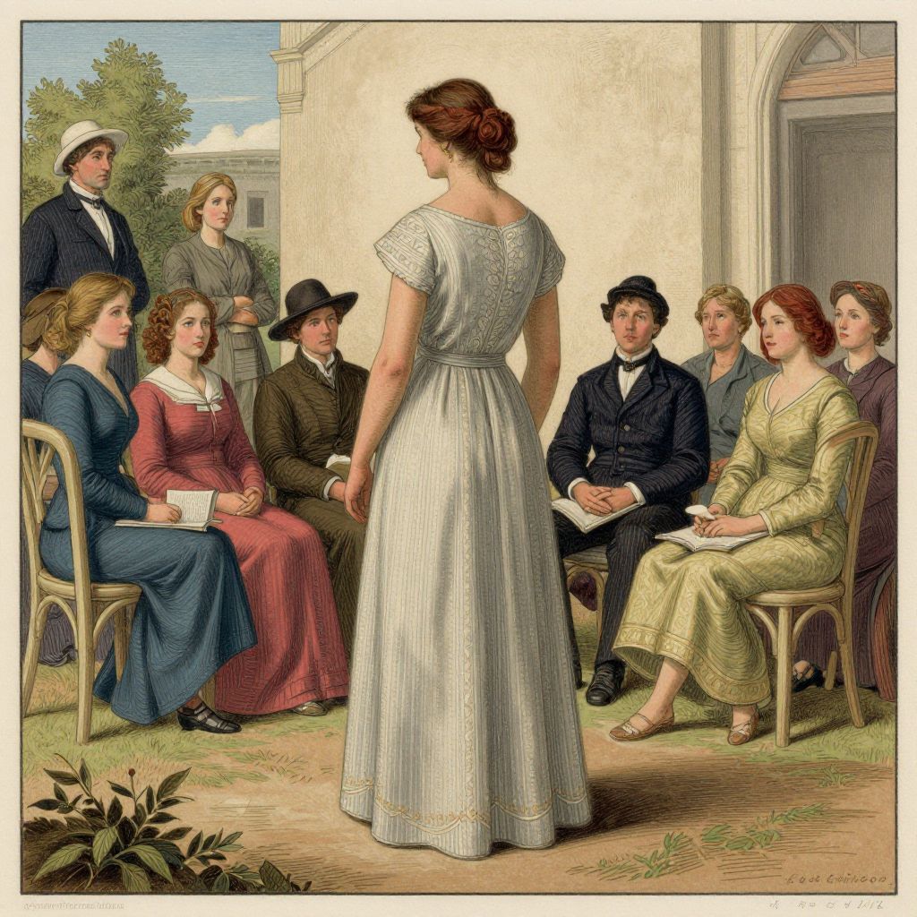 Illustration of a red-haired woman in a blue dress standing center, surrounded by seated and standing people in 19th-century clothing, under a tree