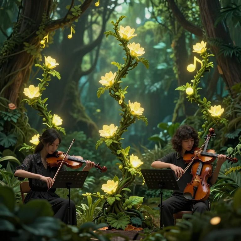 Melodies grow as physical vines in a symphonic jungle — each note a glowing bloom that blooms anew when played on a violin.