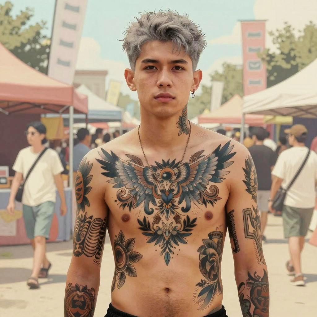 Realistic photo.gray hair, body mod tattoos, illustration, street festival, detailed, pastel colors, dramatic, graphic novel illustration, 2d shaded retro comic book realistic photo