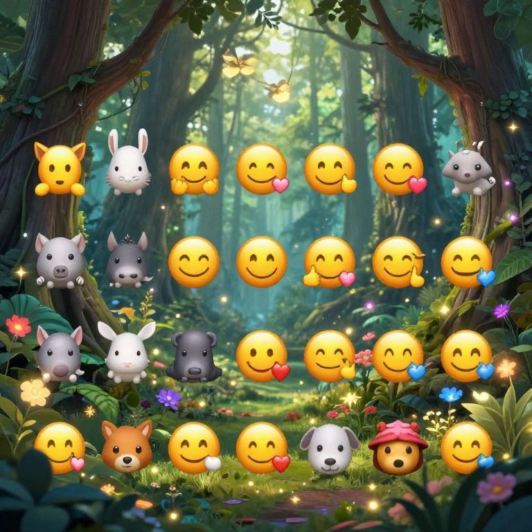 Pictures made with emojis showcasing a fantasy forest filled with emoji animals and magical creatures, leaves and flowers made from diverse colorful emojis, mystical and dreamy vibe, high detail with glowing emoji elements and soft lighting