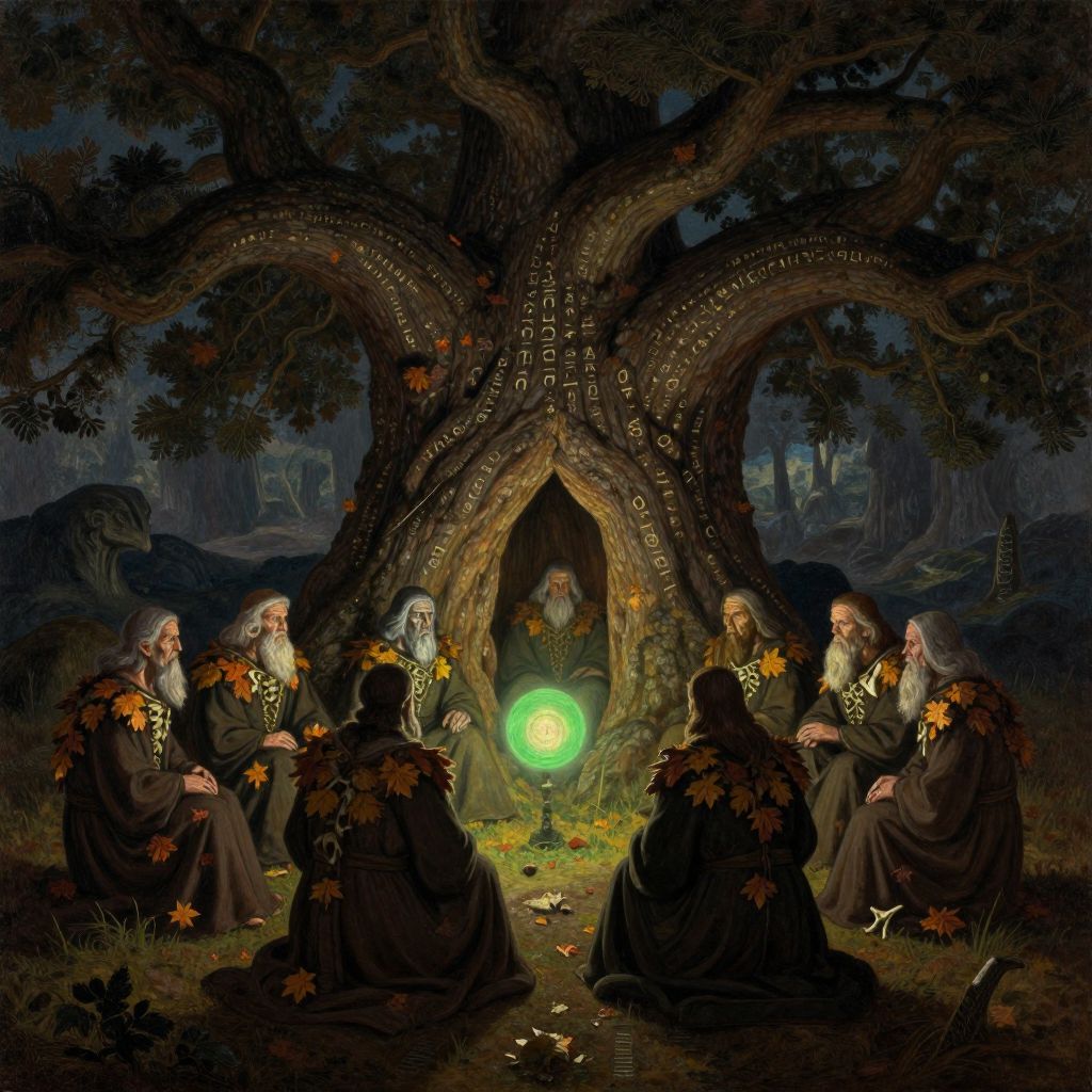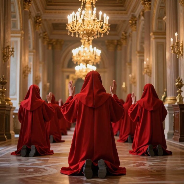 Time-keepers draped in crimson robes gather solemnly around a colossal tree adorned with golden clocks, harvesting moments suspended from its branches, as they trade these fleeting seconds at an intersection where time itself is bartered as currency.