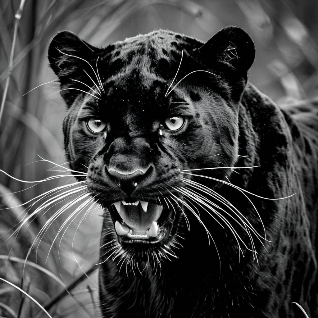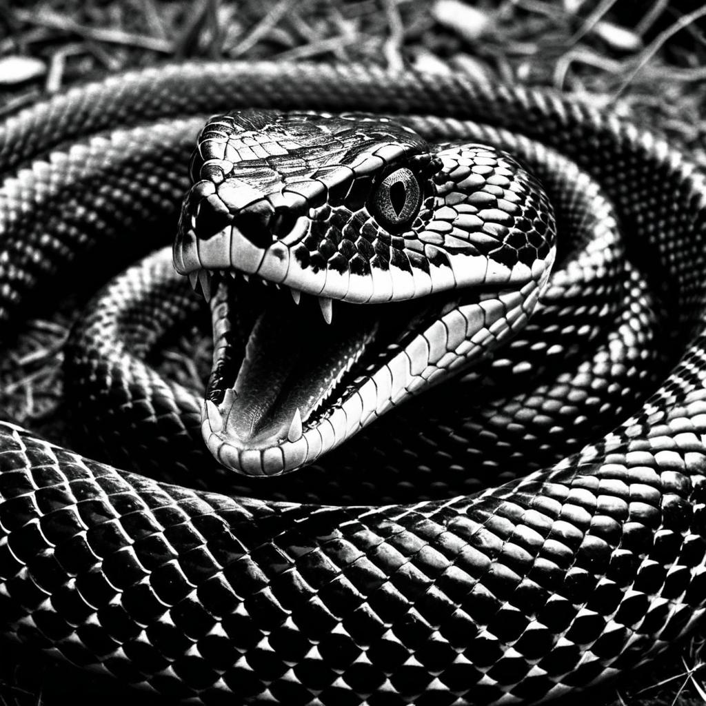 High-contrast black and white close-up photograph of a coiled black snake with its mouth open, showing sharp fangs and detailed scales. The snake's intense eyes and flared scales convey a sense of alertness and tension. The background is blurred with natural ground elements.