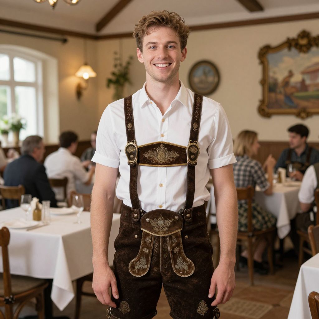 Oktoberfest Inspired Costume, dressed in a traditional bavarian outfit standing in a restaurant