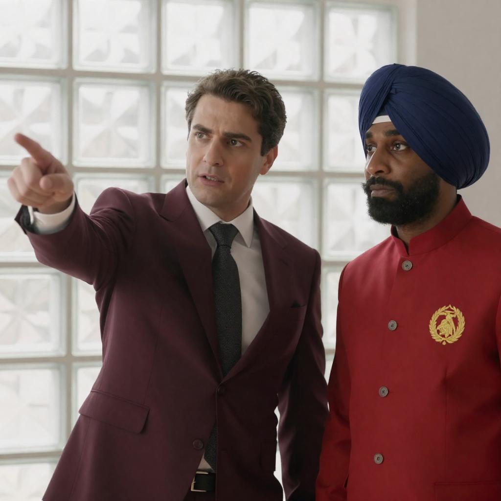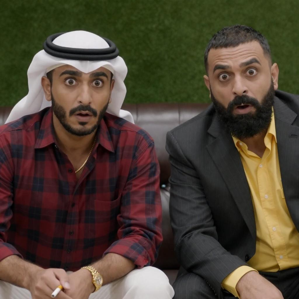 Two men with thick beards and intense, surprised expressions sitting closely on a brown leather couch. The man on the left wears a white keffiyeh, red plaid shirt, gold necklace, and white pants while holding a cigarette. The man on the right wears a dark pinstripe suit with a yellow shirt. The background features green foliage.