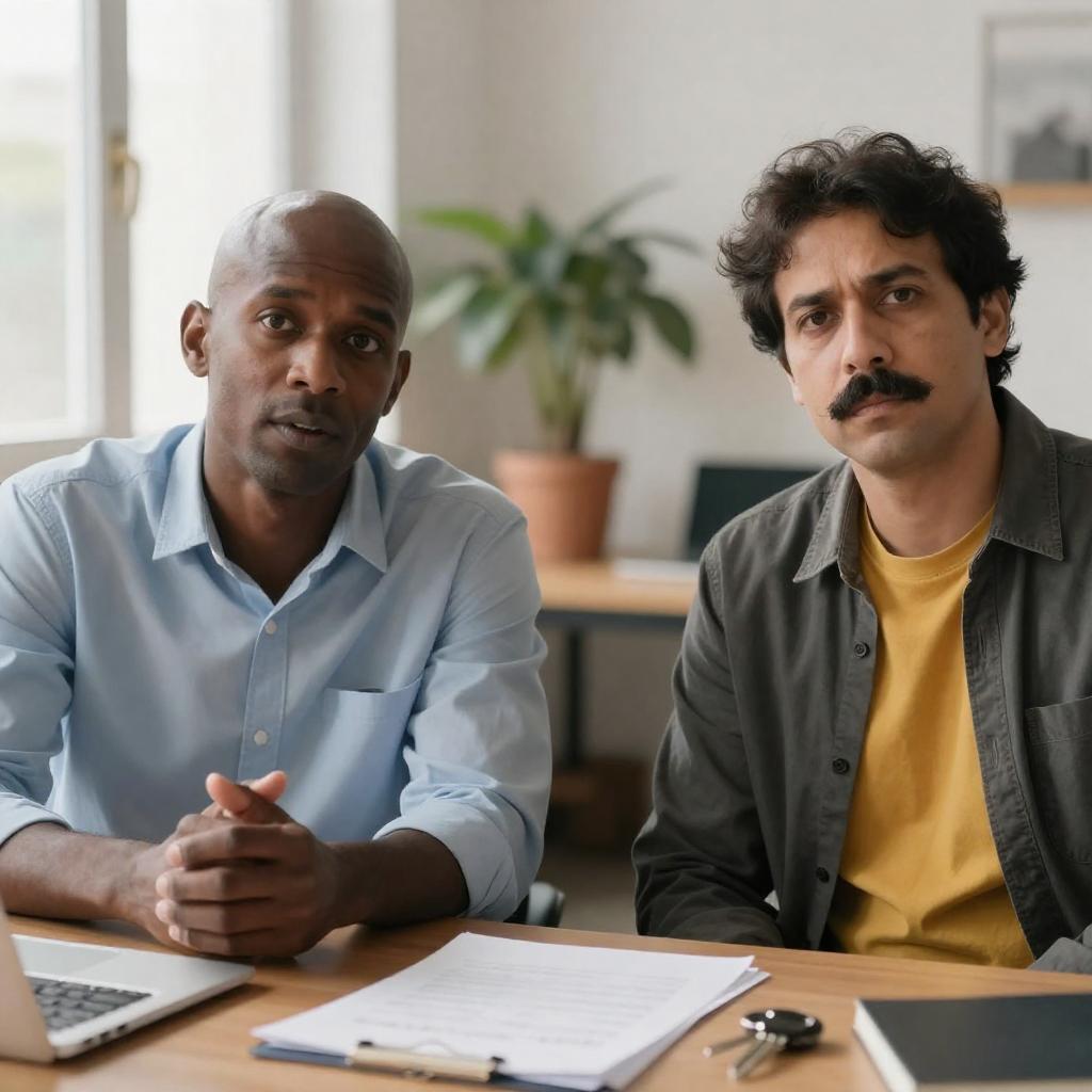 Two men with intense, surprised expressions. Left man wears white keffiyeh, red plaid shirt, gold necklace, holding cigarette. Right man in dark pinstripe suit, yellow shirt, both have thick beards. Background with green foliage, leather couch. Both lean forward.