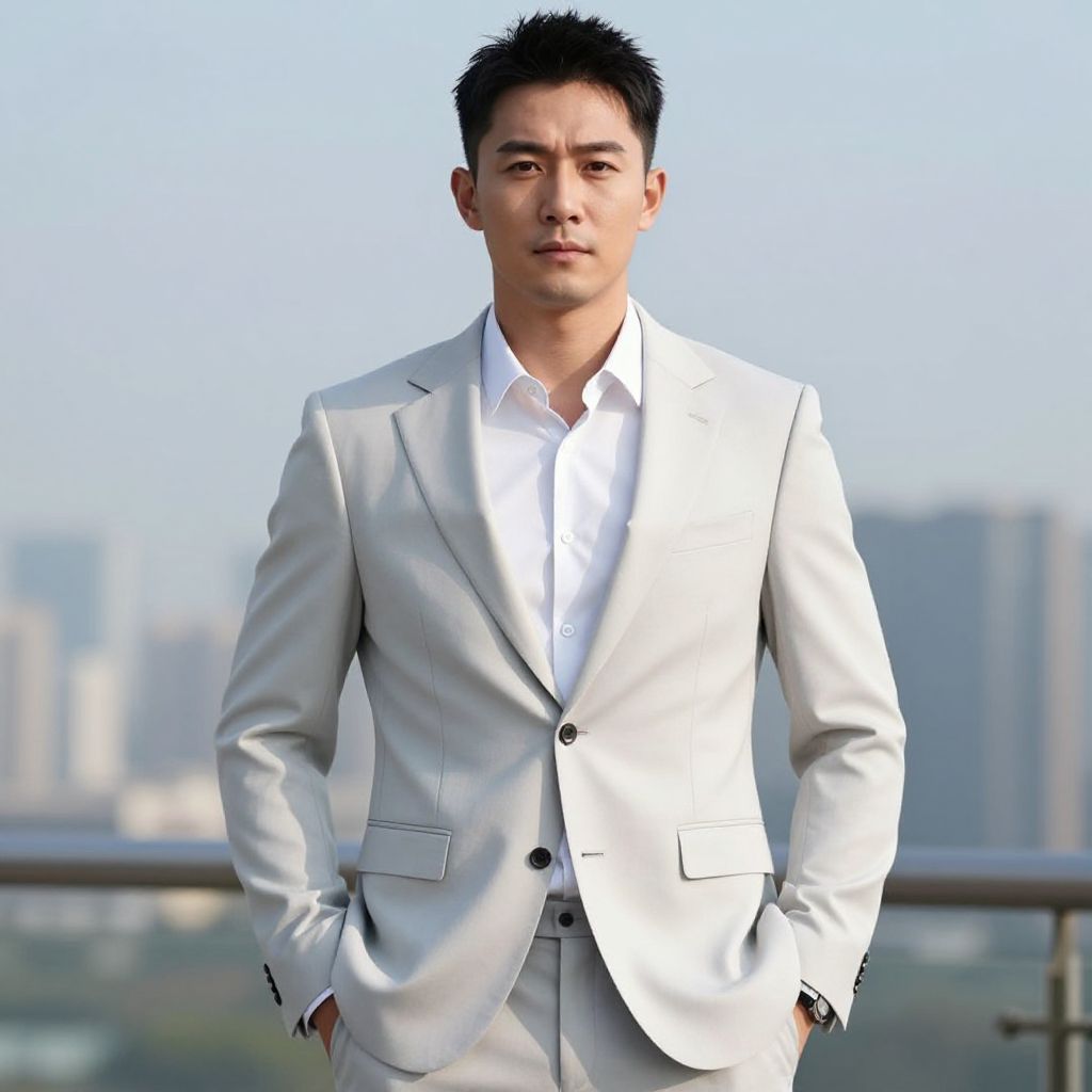 Photograph of an Asian man with short, spiky black hair, smiling widely. He's wearing a blue, textured blazer over a white button-down shirt, with dark jeans and a black belt. His right hand is behind his head, leaning against a concrete wall with neon lights in the background. The setting is a dimly lit, urban street at night, with blurred storefronts in the distance. The man's confident pose and bright smile convey a friendly, approachable demeanor. The image has a vibrant, slightly dramatic lighting effect.