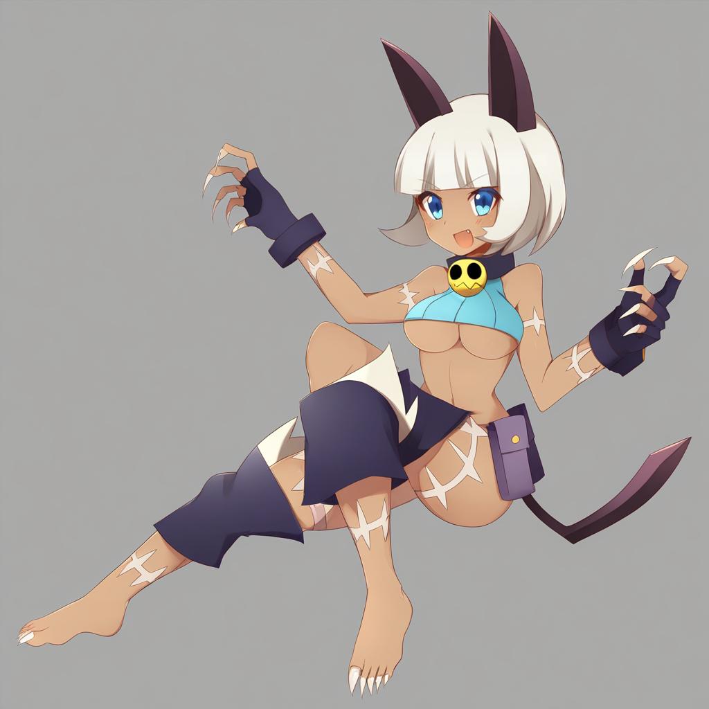 Ms. fortune (skullgirls), skullgirls, 1girl, dark-skinned female, cat ears, cat tail, fang, blue eyes, short hair, white hair, bob cut, medium breasts, large breasts, underboob, navel, barefoot, scar, fingerless gloves, bare shoulders, belt, collar, sharp fingernails, crop top, midriff, by artist rento (rukeai), leet