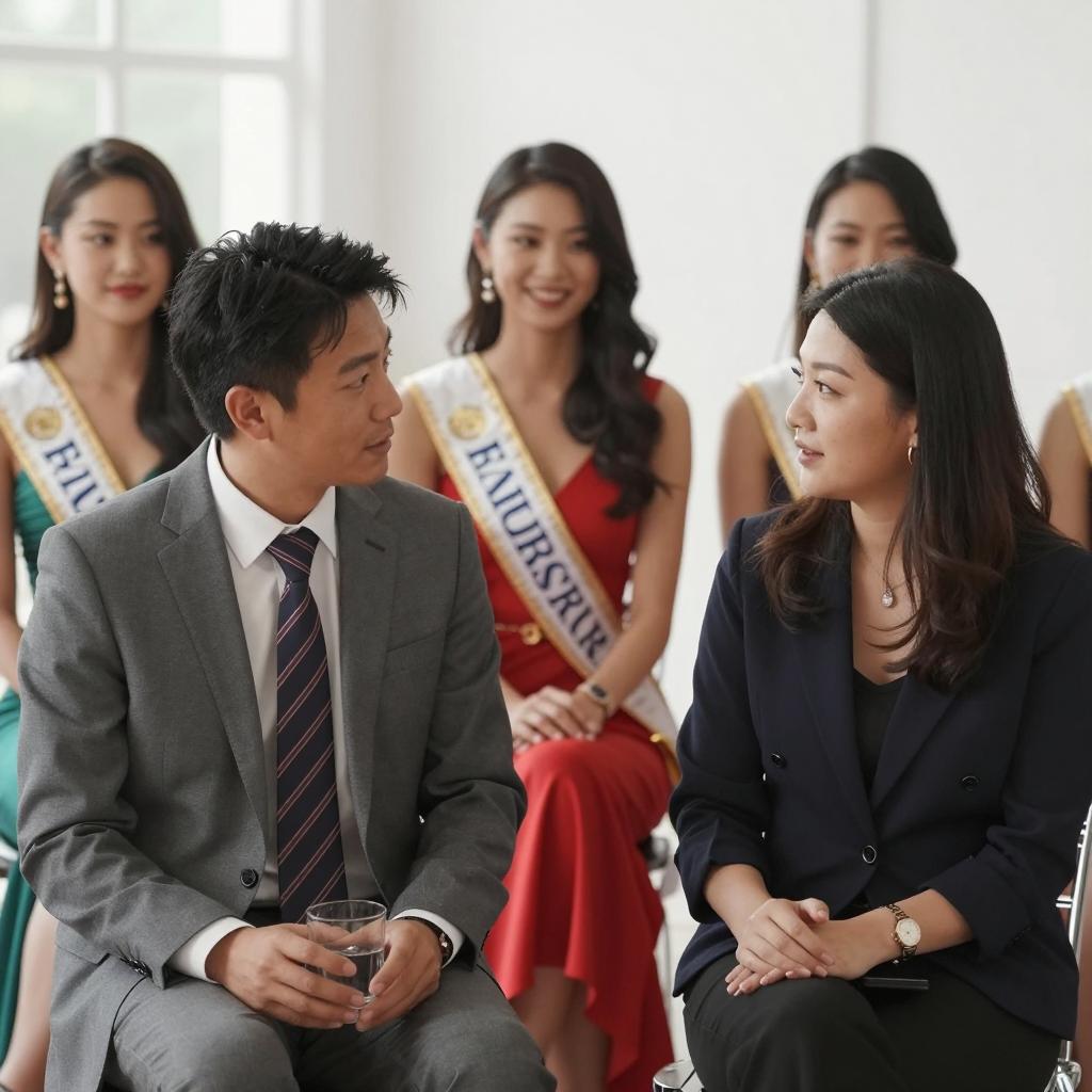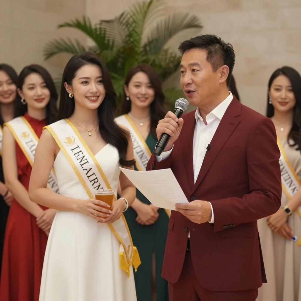 Man in red suit, black shirt, holding microphone, speaking passionately. Red-haired woman in white dress, holding microphone, standing beside him. Background: group of women in dresses with sashes, standing in line. Indoor setting with plants and dim lighting.
