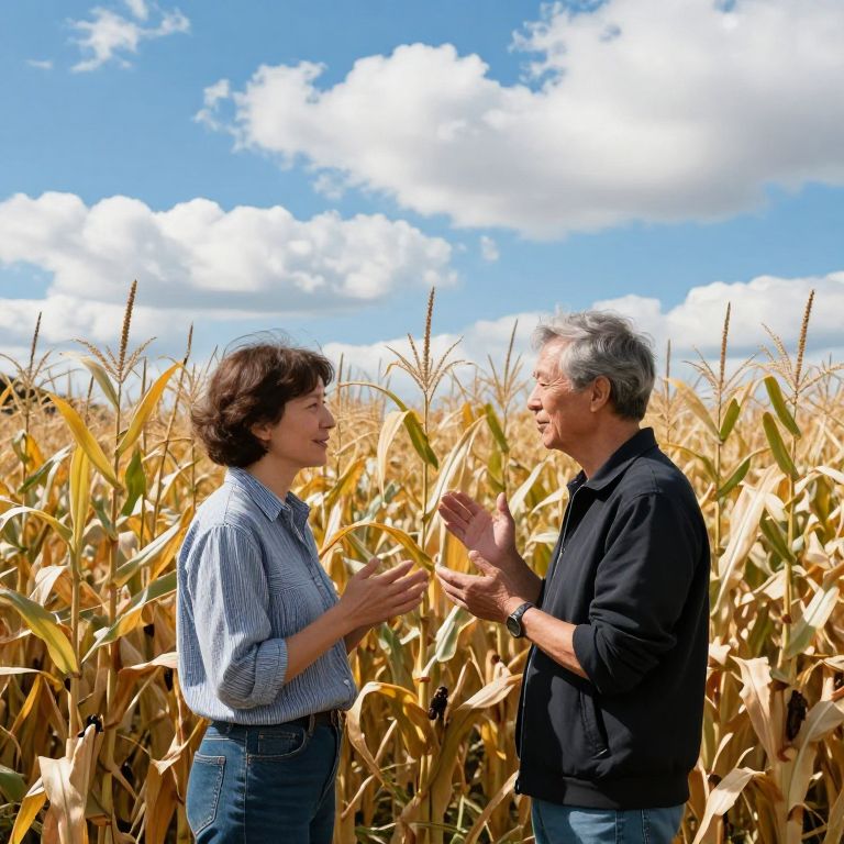 Photograph of an outdoor scene featuring a middle-aged woman and man standing in a golden cornfield under a bright blue sky with white clouds. The woman, with short dark brown hair, wears a blue and white striped shirt and blue jeans, gesturing with her hands. The man, with gray hair, wears a black jacket and blue jeans, facing her. Both are engaged in conversation. The tall corn plants dominate the background, with their yellowish leaves and stalks creating a textured, natural setting. The sunlight highlights the scene, casting soft shadows.