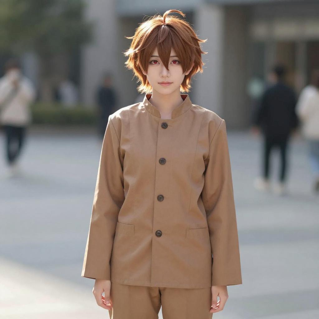 Photo-realistic portrait of a young person cosplaying as Morisawa Chiaki, wearing a brown traditional Japanese school uniform with long sleeves and matching pants. The individual has short brown hair and striking red eyes, standing outdoors with a soft blurred background and natural lighting.