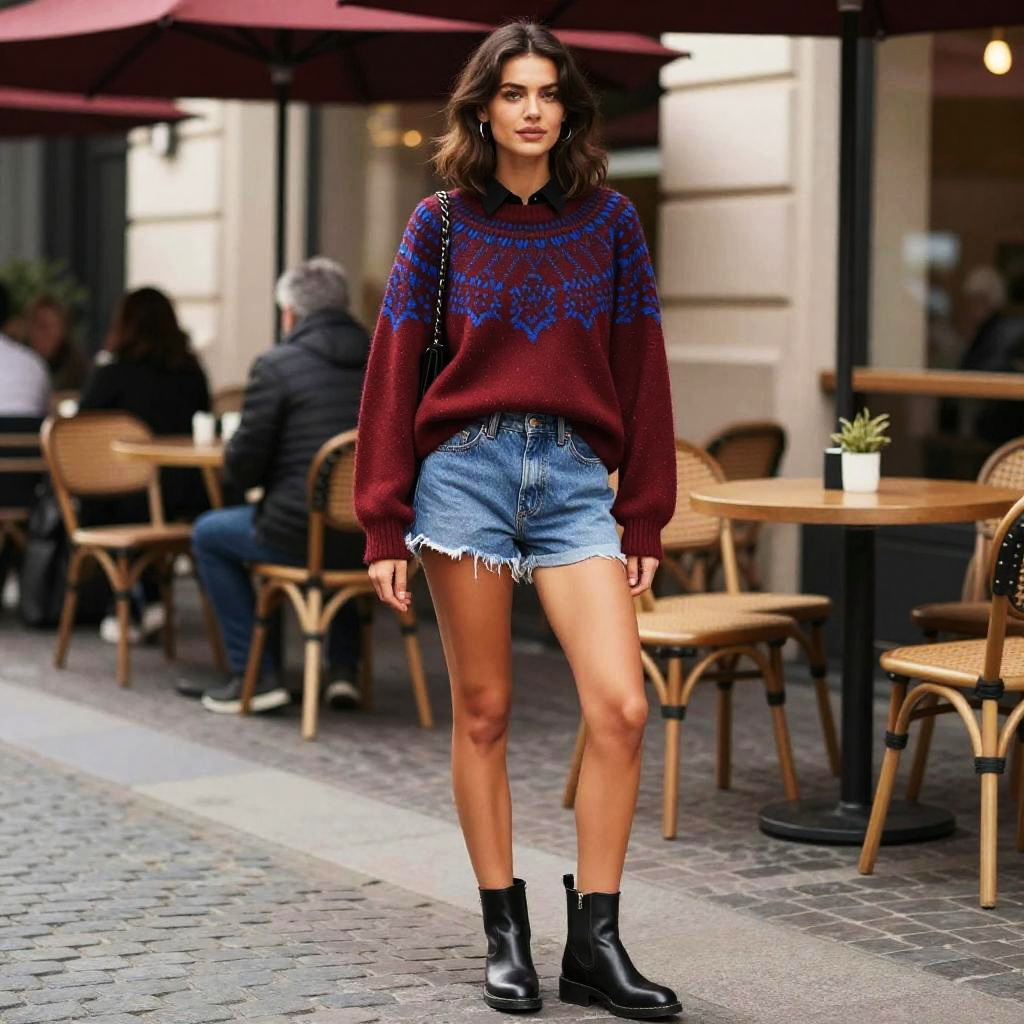 A Pear-shaped body type woman, styled in a mappa studio visual aesthetic, wearing a navy blue corduroy mini pinafore dress layered over a marled knit sweater, complemented by a caramel brown parka with a fur-lined hood and chunky black lace-up boots. She stands in a lively plaza café, enjoying the vibrant atmosphere. Sexy. Pretty face and beutiful eyes