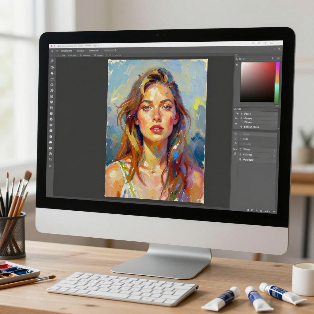 Convert photo to oil painting online free, a vibrant digital workspace with a computer screen showing a photo transforming into a detailed oil painting, surrounded by brushes and paint tubes, soft natural lighting, artistic atmosphere, digital art style.