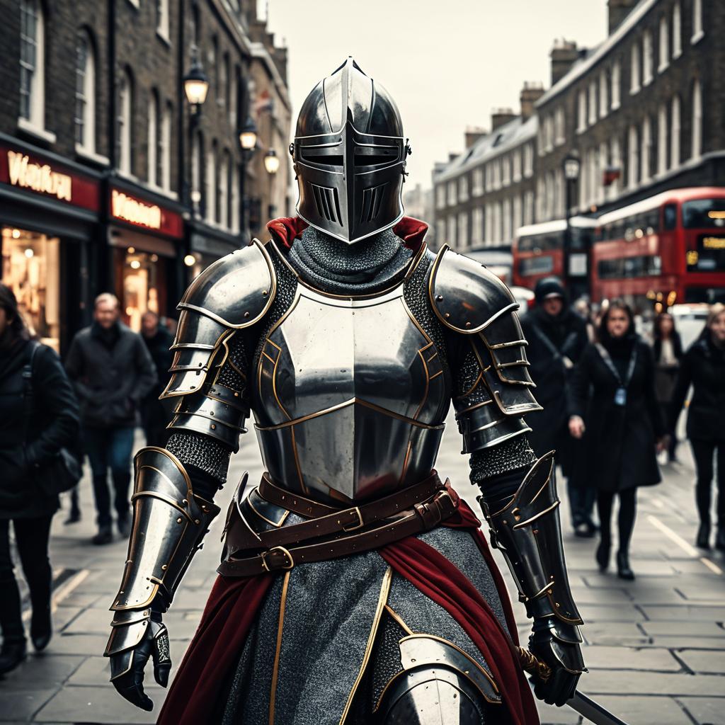 Full view of a female knight wearing detailed medieval armor standing on a busy London street. The armor includes a steel helmet with a visor, metal chest plate, and arm guards, complemented by chainmail and red and grey cloth accents. The background features iconic London elements such as double-decker buses and historic buildings.
